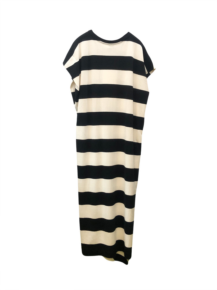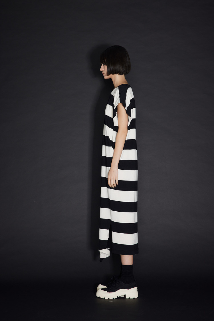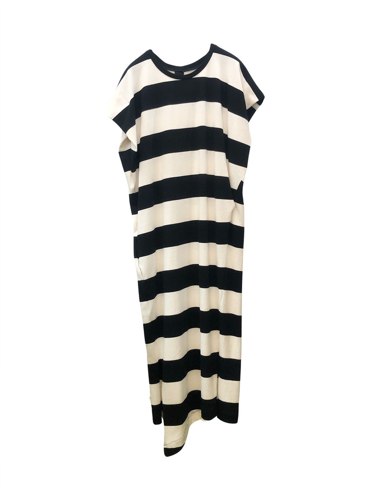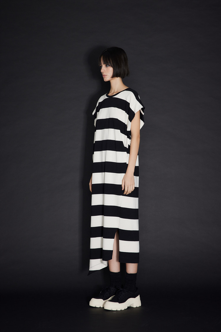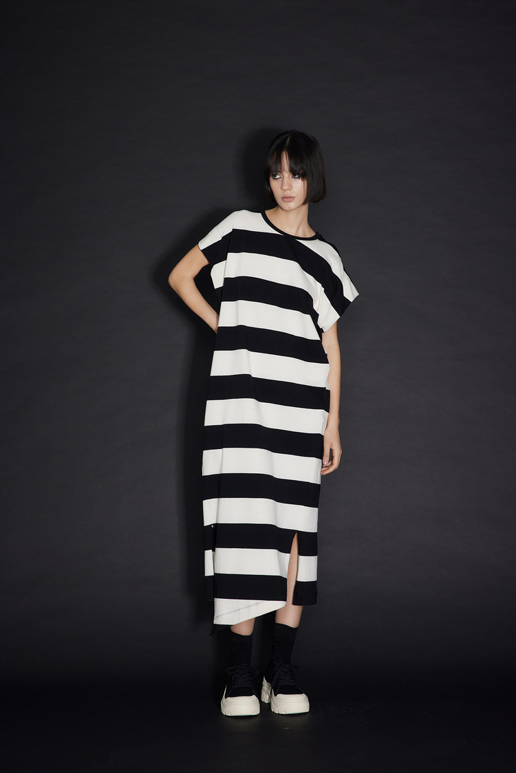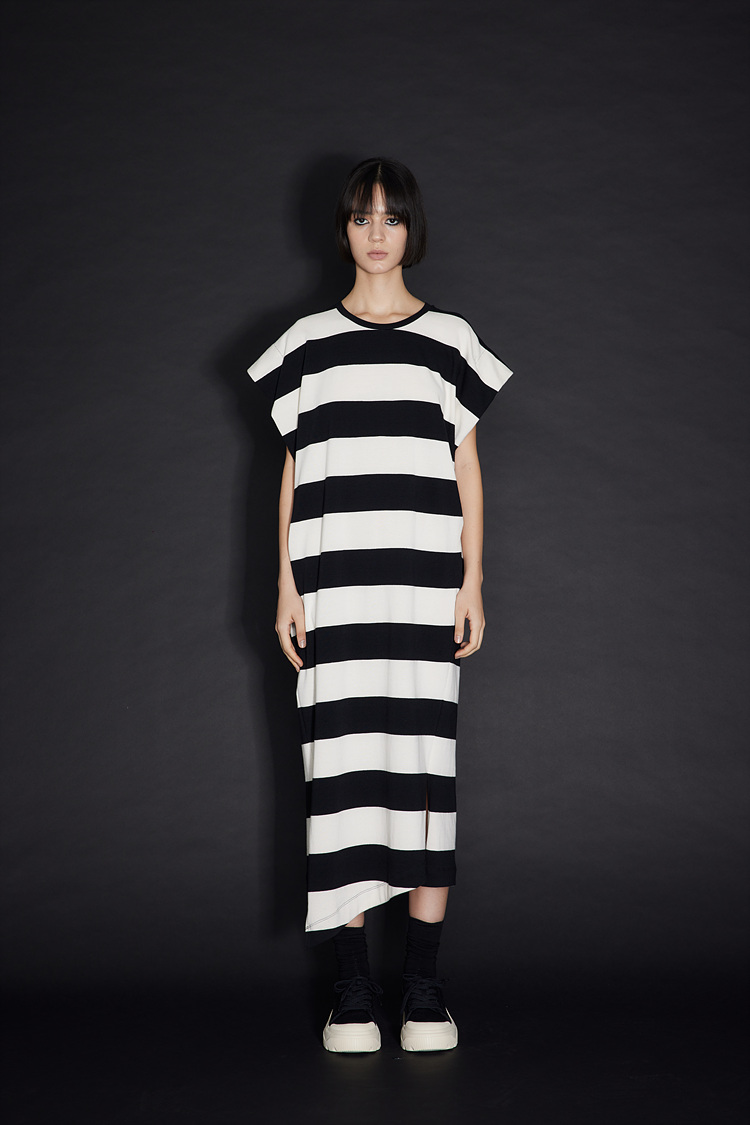 - 언밸런스한 밑단 라인과 스트라이프 패턴이 포인트인 원피스입니다.